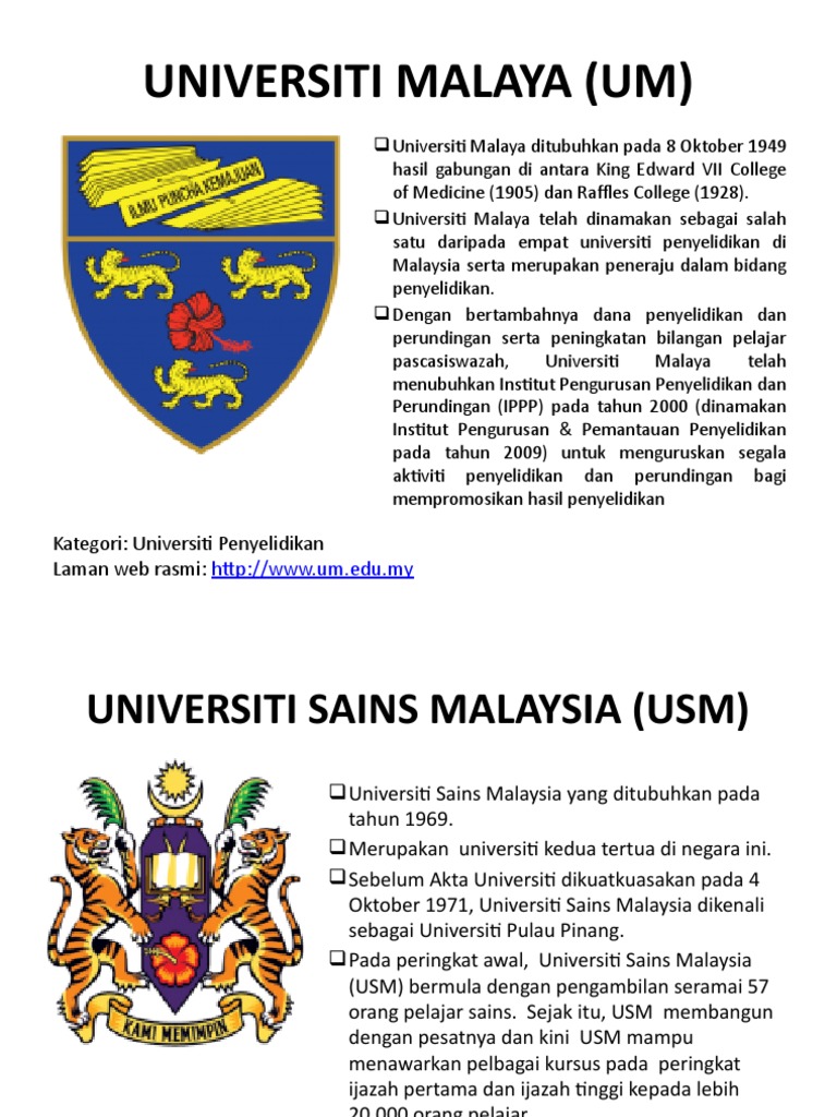 Universiti Malaya UM ialah universiti penyelidikan awam Malaysia. Sebelum Akta Universiti dikuatkuasakan pada 4 Oktober 1971 Universiti Sains Malaysia dikenali sebagai Universiti Pulau Pinang. BAB 2 PENGURUSAN SUKAN 2.